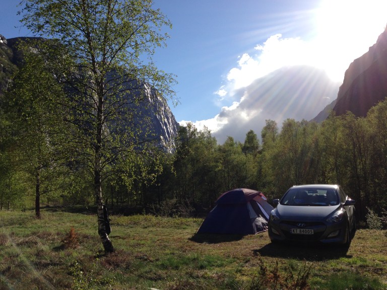 Nope. It was high season and although we acquired a rental car just fine, every hotel in Stavenger was either sold out or $500 USD per night. Aaron at one point was willing to splurge. Being our anniversary, he tried everything he could to find us a room. We drove around in our rental car making phone calls for hours. I was finally able to convince him that it really was OK if we slept in the car, even if it was our anniversary (I kind of liked the idea to be honest- you know, in the spirit of adventure). He finally agreed to end the search and we made our way out to a fairly secluded spot, put sheets up in the windows (OK so not everything ended up fitting in the duffle), and called it a night.