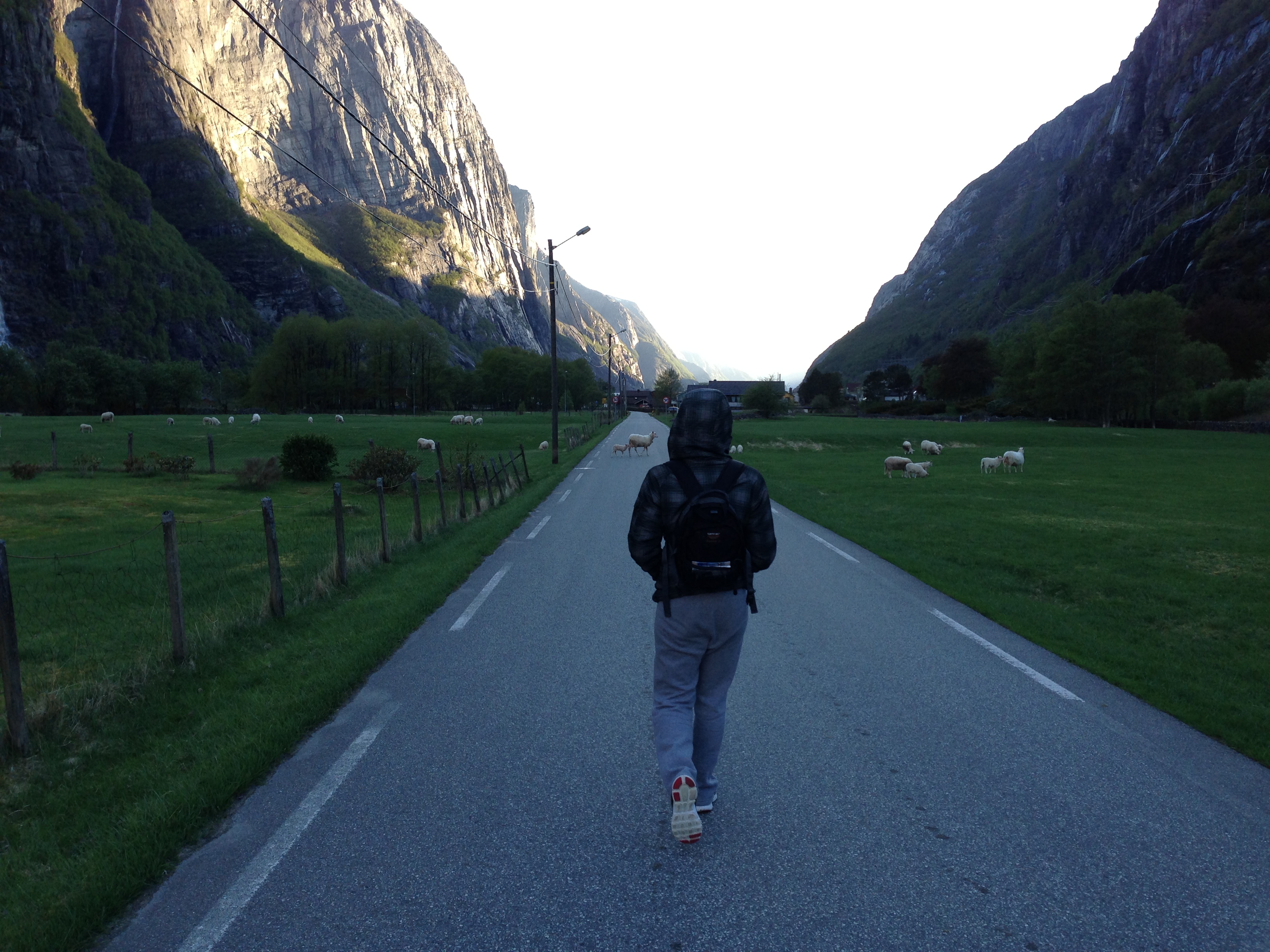 There really isn’t a whole lot I can say that will adequately describe it. The natural landscape down in the valley always seemed to have a mystical blue hue cast over it and there was very little going on. There is no hustle-bustle in Lysebotn during the day. The quickest movement we came across was the lazy meandering of bell adorned sheep. And, the sheep easily outnumbered us human-folk. It was utterly peaceful (<- I want to take a moment to identify that this could have been a funny pun if the sheep were actually cows). I couldn’t help but become a participant in the calm. The stillness around me simply didn’t allow for anything else. From the moment we arrived here, my mind began to undergo some sort of subconscious cleansing. The walks that began down this road often found us wandering up cliff sides in pursuit of the highest waterfall access we could manage. We walked and hiked in this serene landscape a lot.