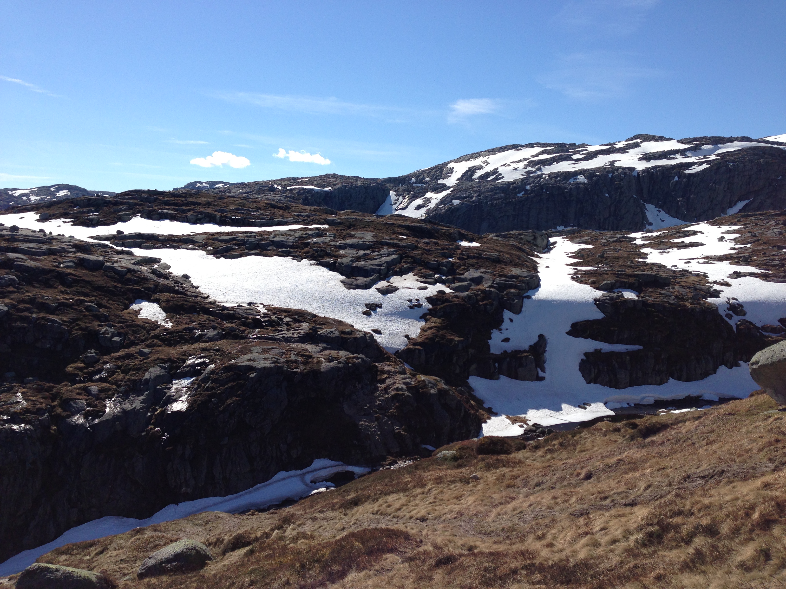 Anyway, the next morning went off without a hitch. We showed up at the airport, quickly swiped our bag, then made a quick stop off at a local grocery store before beginning the 3 hour drive to Lysbotn. We knew that groceries were going to be the most challenging part of this adventure. There is no grocery store in Lysebotn, so we were sure to get enough supplies to last us the 7 days. We did get a few fruits (that lasted maybe into day two), but to last the whole trip we knew we had to load up on a lot of dry foods- cookies, flatbread, peanut butter, and… no, that was pretty much it. Oh, a loaf of bread (how could I forget?)… We did not pack any type of cooking apparatus, which in hindsight may have made things a bit easier. Actually looking back on it now, it seems rather foolish not to have a way to cook warm meals, but I’ll let it slide considering it was really our first low key camping trip. Hey, in the end we did survive! There were times however, when I thought our chances for survival were as skinny as a hipster’s jeans. The drive was one of them.