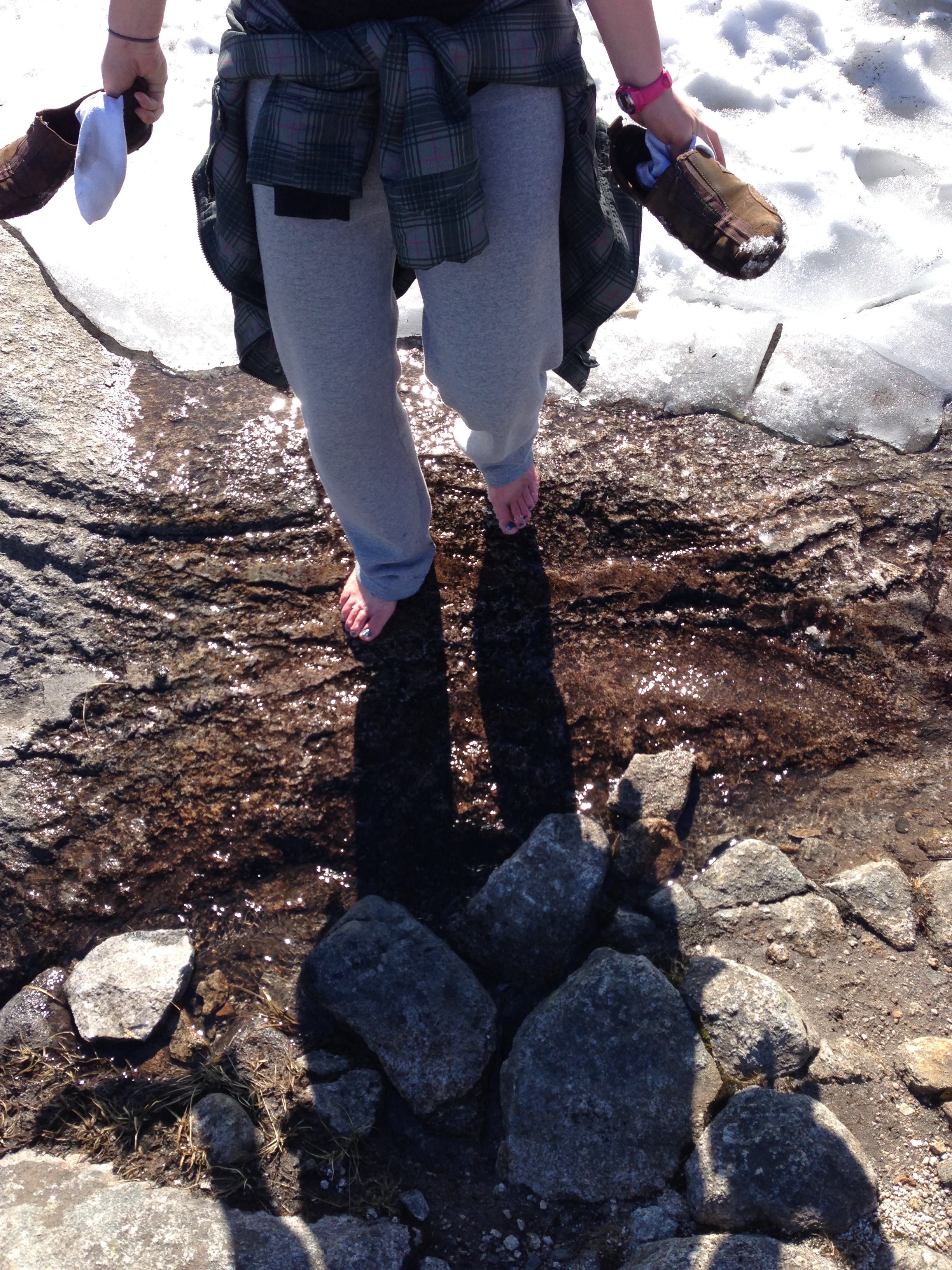 My shoes at one point had become saturated due to the occasional ice/snow patches we traversed, and I remember taking them off at one point to get some relief and to let them air out a bit. This trip was pre-awesome-hiking-shoes, unfortunately (again, NO money).